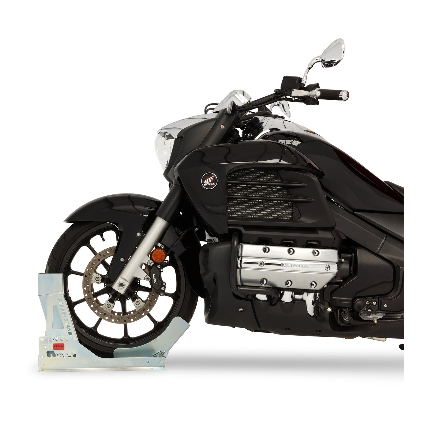 The galvanised Acebikes SteadyStand Multi Fixed is designed to make clever use of gravity during transport and is fully adjustable for almost any type of motorcycle front or rear tyre without any tools.